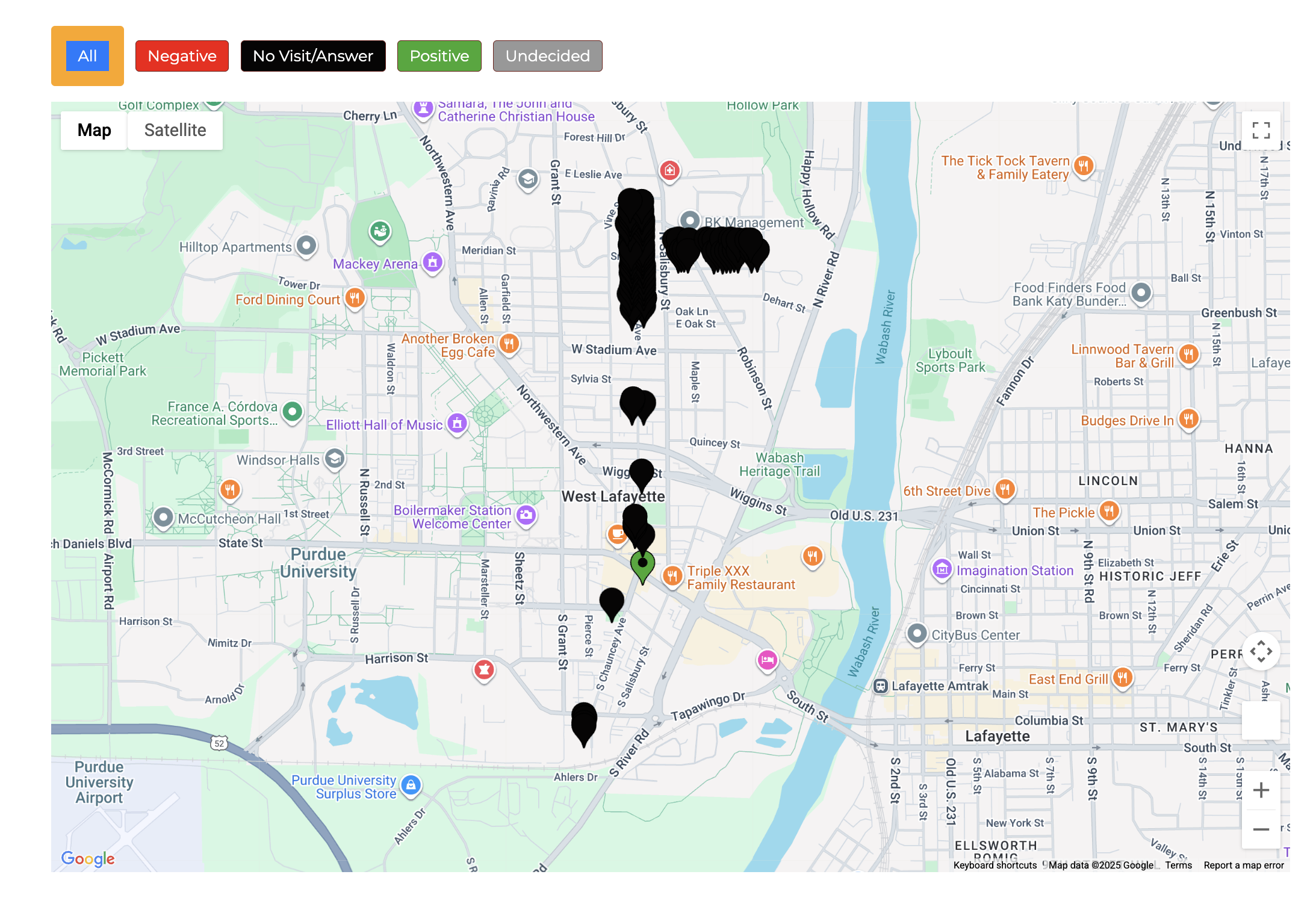 In this project, the client wanted to track door-to-door canvassing. The software we provided geo-coded the provided voter database (only as needed). Then built interactive maps with markers linked to a custom post type where the voter’s response can be recorded (updating the color of the marker on the map.)